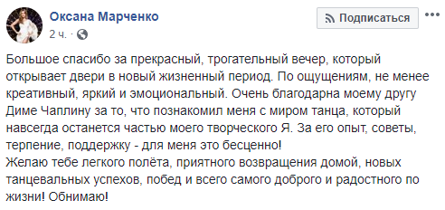 "Большое спасибо за прекрасный, трогательный вечер, который открывает двери в новый жизненный период. По ощущениям, не менее креативный, яркий и эмоциональный. Очень благодарна моему другу Диме Чаплину за то, что познакомил меня с миром танца, который навсегда останется частью моего творческого Я. За его опыт, советы, терпение, поддержку - для меня это бесценно! Желаю тебе легкого полёта, приятного возвращения домой, новых танцевальных успехов, побед и всего самого доброго и радостного по жизни! Обнимаю!" - написала Марченко на своей станице в Facebook, сопроводив текст снимками, на которых она распивает шампанское в коллективом программы.
