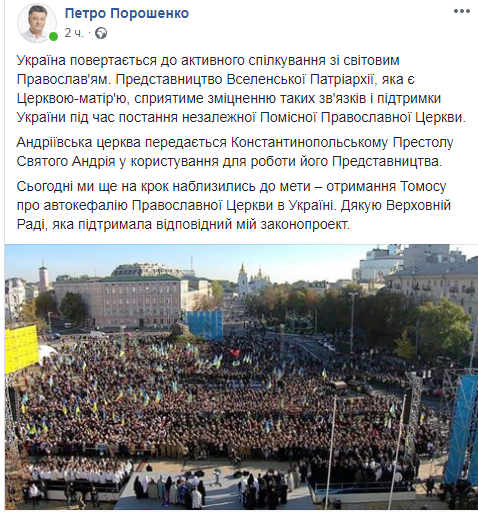 В сообщении президент написал, что данное решение - это "возвращение Украины к активному общению с мировым православием". Кроме того, Порошенко, выражая благодарность Раде, подчеркнул, что соответствующий законопроект подготовил он.