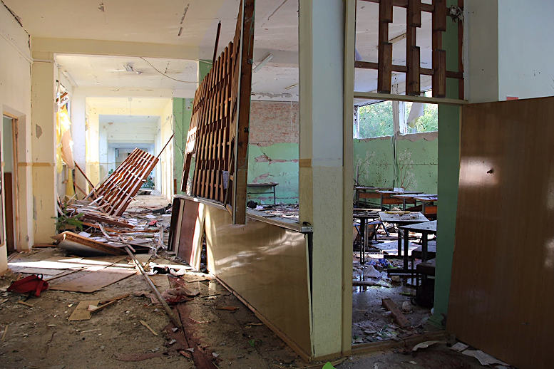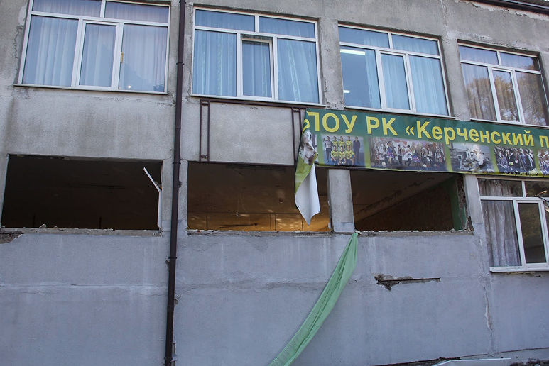 Судя по фото, на первом и втором этажах произошли наиболее крупные повреждения здания. В одном из классов уже демонтировали пластиковые окна, пришедшие в негодность после стрельбы.