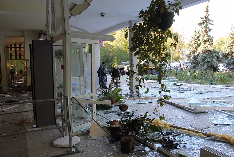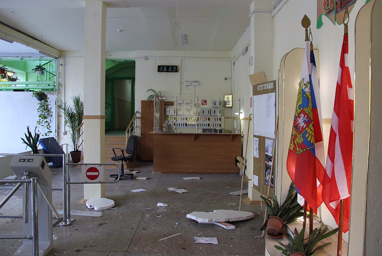 Серьезный ремонт потребуется везде: в фойе отсутствуют стекла, повалены вазоны. На полу, стенах - следы крови.