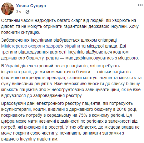 Полное возмещение стоимости препаратов инсулина Минздрав планирует начать в 2019 году. В этом году из госбюджета выделены средства на возмещение 75% инсулина. Об этом сообщила глава министерства Ульяна Супрун на своей странице в Facebook.