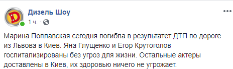 "Марина Поплавская сегодня погибла в результате ДТП по дороге из Львова в Киев. Яна Глущенко и Егор Крутоголов госпитализированы без угроз для жизни. Остальные актеры доставлены в Киев, их здоровью ничего не угрожает", - сказано в сообщении.