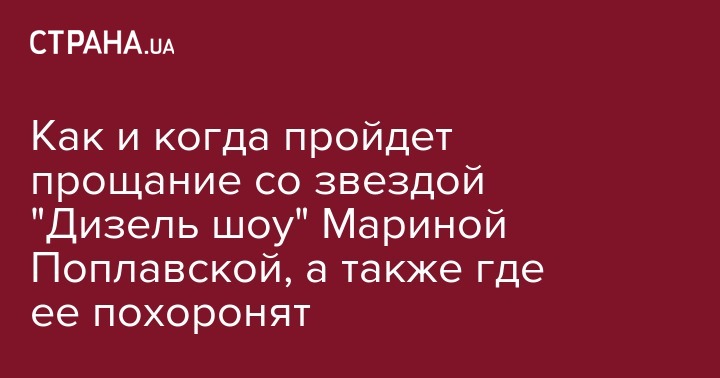 Звезду юмористического проекта "Дизель шоу" Марину Поплавскую, трагически погибшую  ДТП, похоронят на ее родине в Житомире, но прощание состоится и в Киеве, и в Житомире. Об этом сообщили в пресс-службе "Дизель Студио".