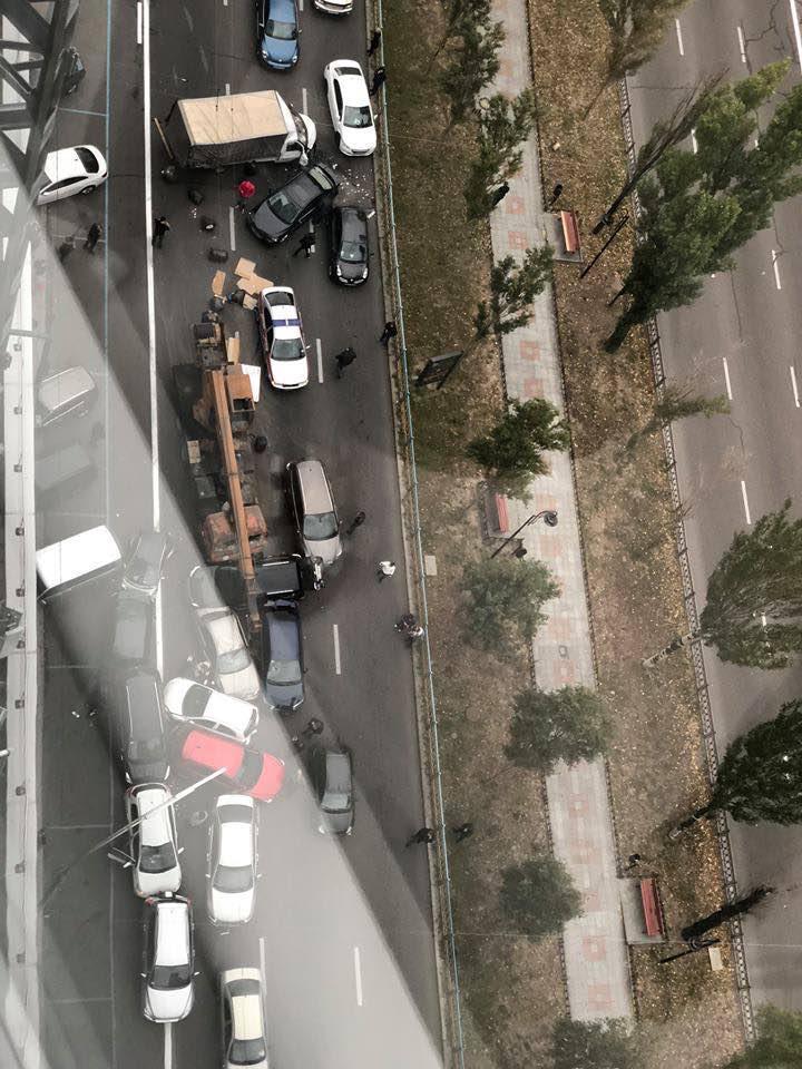 Инцидент произошел около 09:00 возле БЦ Парус. По данным полиции Киева, столкновение спровоцировал автокран КамАЗ с нерабочими тормозами, который на скорости спускался вниз. О неисправности сообщил сам водитель транспортного средства. Полиция проверяет эту версию. По последним данным, в результате ДТП пострадали 18 легковых автомобилей и грузовик.