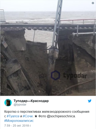 В социальных сетях жители выкладывают фото- и видеозаписи происходящего. Так, стихия разрушила мост в районе Макопсе на трассе между Сочи и Туапсе. "Никто никуда не едет. Аномальный паводок на реке Макопсе в Лазаревском районе Сочи повредил подход к автодорожному мосту. Здесь разрушен 20-метровый участок федеральной трассы. Прекращено автомобильное сообщение между Туапсе и большей частью Лазаревского района Сочи", - говорится в сообщении.