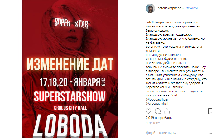 "Я готова принять в жизни многое, но даже для меня это было слишком. Благодарю всех за поддержку. Благодарю жизнь за то, что больно, но не фатально. Организм - это машина. И иногда она ломается. Но наш дух не сломлен. И скоро мы будем в строю. Все билеты действительны. Если вы не сможете посетить наше шоу в январе - вы можете вернуть билеты. С большим уважением к каждому, кто все эти дни был с нами и к каждому, кто любит артиста и желает ему здоровья. Берегите себя и близких. Это всего лишь временные трудности. И скоро снова в бой!", - написалана своей странице в Instagram Крапивина.