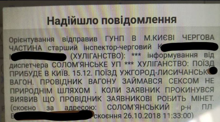 Журналист Александр Рудоманов выложил снимок сообщения о происшествии, которое случилось в поезде Ужгород - Лисичанск в 11:33. Согласно тексту картинки, в полицию якобы пришло уведомление о "хулиганстве". "Проводник вагона занимался сексом неприродным путем. Когда заявитель проснулся, обнаружил, что проводник заявителю делает минет", - написано в сообщении.
