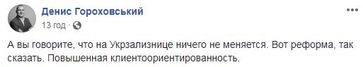 "А вы говорите, что на Укрзализнице ничего не меняется. Вот реформа, так сказать. Повышенная клиентоориентированность", - пишет блогер Денис Гороховский.