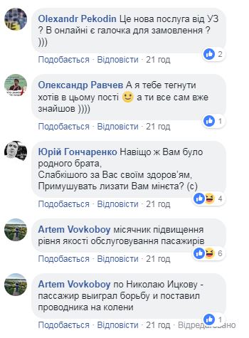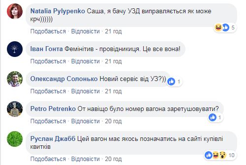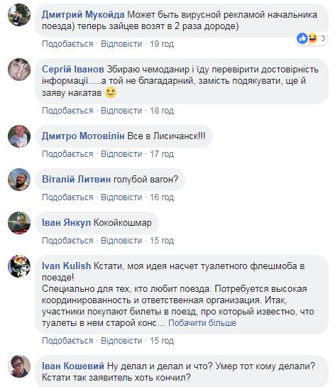 Не менее смешными были и комментарии к посту: "Что, плохо делал?", "Вот, почему отсутствуют билеты на этот поезд", "Может быть вирусной рекламой начальника поезда", "Собираю чемоданы и еду проверять достоверность информации", "Голубой вагон?", "Месячник улучшенного уровня качества обслуживания пассажиров", "Новая услуга от УЗ? В онлайне есть галочка для заказа?", "Вижу, Укрзализныця исправляется как может", - острят пользователи Сети.