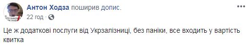 "Это же дополнительные услуги от Укрзализныци, без паники, все входит в стоимость билета", - отмечает блогер Антон Ходза.