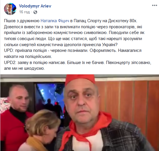 "Пошел с женой Наталья Фицич во Дворец Спорта на "Дискотеку 80-х". Пришлось вывести из зала и вызвать полицию из-за провокаторов, которые пришли с запрещенной коммунистической символикой. Вели себя как типичные советские люди. Что еще должно произойти, чтобы такие наконец поняли сколько смертей коммунистическая идеология принесла Украине?