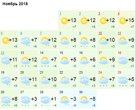 По данным Gismeteo ноябрь нельзя будет назвать безоблачным, начиная со второй недели будут периодически идти дожди, иногда с мокрым снегом. С 14 ноября ночью на несколько дней ударят морозы. Ночной минус вернется и в последнюю неделю месяца.