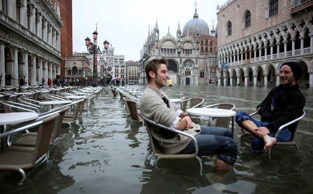 В Венеции несмотря на непогоду и затопленные улицы много людей. Они передвигаются по городу в высоких резиновых сапогах, чемоданы и сумки носят на плечах. Кстати, наводнение не помешало провести в городе запланированный марафон. Спортсмены храбро бежали прямо по затопленным улицам.