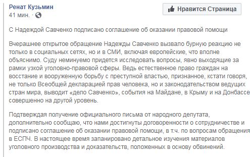 Ренат Кузьмин уже сообщил в Facebook, что подписал Надеждой Савченко соглашение об оказании правовой помощи. "Нами достигнуты договоренности о сотрудничестве и подписано соглашение об оказании правовой помощи, в т.ч. по вопросам обращения в ЕСПЧ. В настоящее время запанировано детальное изучения материалов уголовного производства и доказательств, положенных в основу обвинений", - отметил Кузьмин.