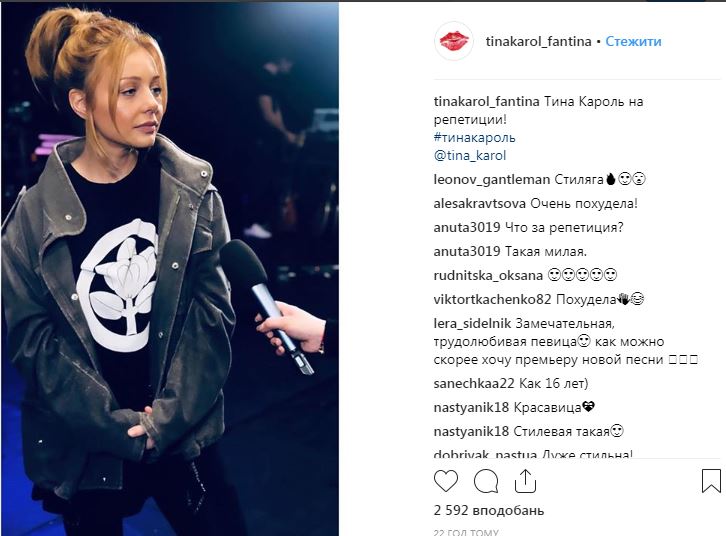 "Тина Кароль на репетиции!" - коротко подписан кадр. На снимке певица позирует не в облегающем платье и с красной помадой, а в куртке оверсайз, черной футболке с принтом и черных штанах. На лице - минимум косметики.