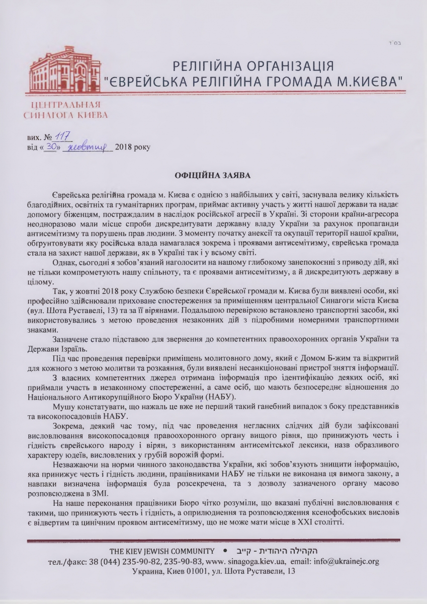 В нем речь идет о том, что в октябре 2018 года служба безопасности Еврейской общины Киева обнаружила лиц, которые профессионально следили за помещением центральной Синагоги в Киеве, которая располагается по адресу улица Шота Руставелли, 13, и за ее прихожанами.