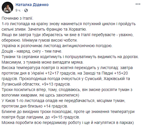 Погода в Украине в четверг, 1 ноября, будет необычайно теплой и солнечной, а в восточных областях температура упадет до нуля. Об этом сообщила синоптик Наталья Диденко на своей странице в Facebook.