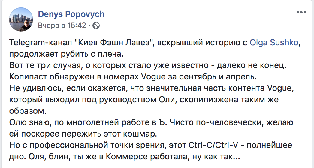 "Не удивлюсь, если окажется, что значительная часть контента Vogue, который выходил под руководством Оли, скопи...жена таким же образом. Олю знаю по многолетней работе в Ъ. Чисто по-человечески, желаю ей поскорее пережить этот кошмар. Но с профессиональной точки зрения, этот Ctrl-C/Ctrl-V – полнейшее дно. Оля, блин, ты же в Коммерсе работала, ну как так", – пишет журналист Денис Попович.