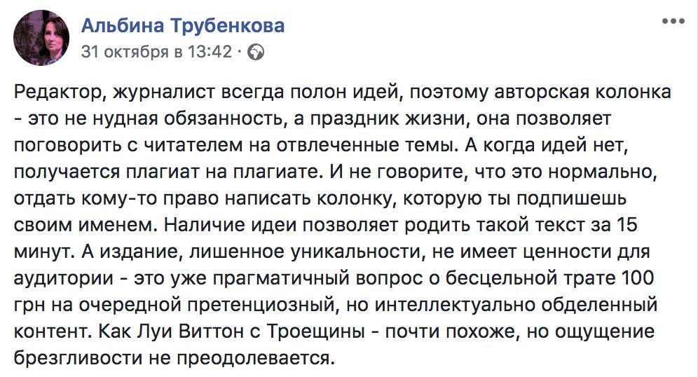 "Редактор, журналист всегда полон идей, поэтому авторская колонка – это не нудная обязанность, а праздник жизни, она позволяет поговорить с читателем на отвлеченные темы. А когда идей нет, получается плагиат на плагиате. И не говорите, что это нормально, отдать кому-то право написать колонку, которую ты подпишешь своим именем. Наличие идеи позволяет родить такой текст за 15 минут. А издание, лишенное уникальности, не имеет ценности для аудитории – это уже прагматичный вопрос о бесцельной трате 100 грн на очередной претенциозный, но интеллектуально обделенный контент. Как Луи Виттон с Троещины – почти похоже, но ощущение брезгливости не преодолевается", – пишет журналист Альбина Трубенкова.