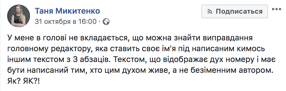 "У меня в голове не укладывается, что можно найти оправдание главному редактору, которая ставит свое имя под написанным кем-то другим текстом из 3 абзацев. Текстом, который отражает дух номера и должен быть написан тем, кто этим духом живет, а не безымянным автором. Как?" – пишет Татьяна Микитенко (проект "Рагули").