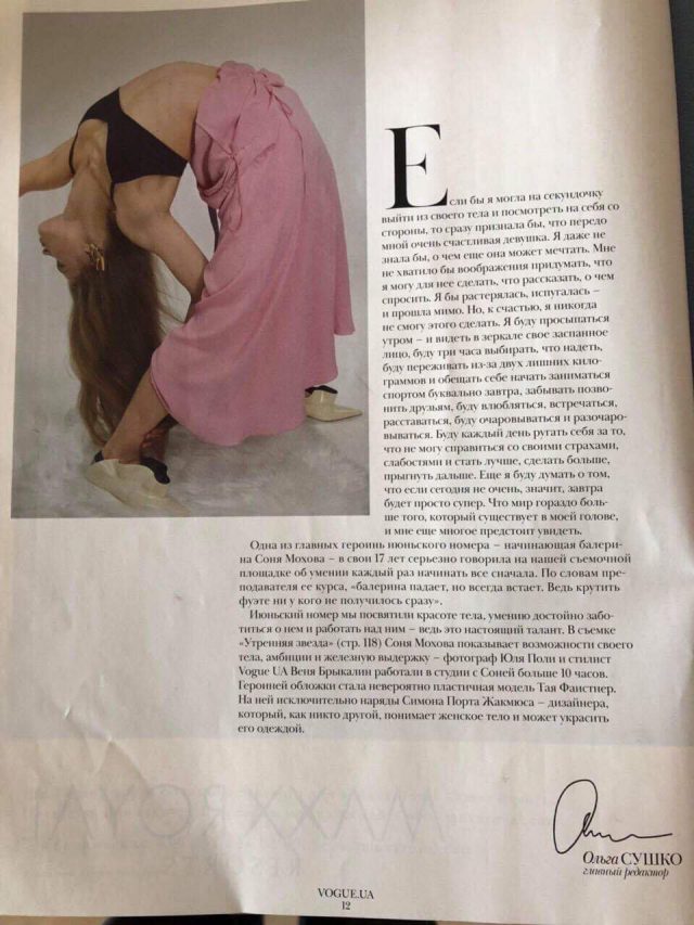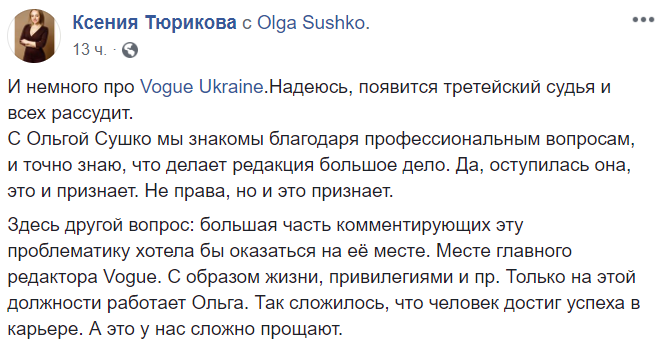 "И немного про Vogue Ukraine.Надеюсь, появится третейский судья и всех рассудит. С Ольгой Сушко мы знакомы благодаря профессиональным вопросам, и точно знаю, что делает редакция большое дело. Да, оступилась она, это и признает. Неправа, но и это признает.