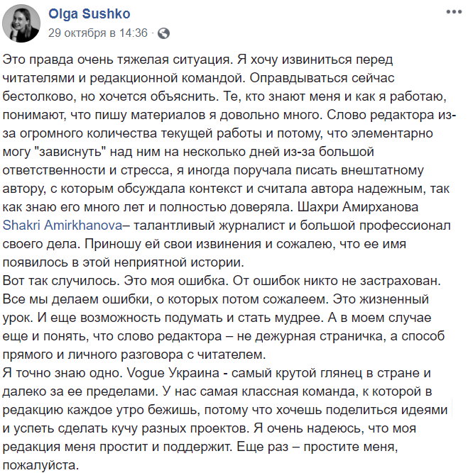 "Это правда очень тяжелая ситуация. Я хочу извиниться перед читателями и редакционной командой. Оправдываться сейчас бестолково, но хочется объяснить. Те, кто знают меня и как я работаю, понимают, что пишу материалов я довольно много. Слово редактора из-за огромного количества текущей работы и потому, что элементарно могу "зависнуть" над ним на несколько дней из-за большой ответственности и стресса, я иногда поручала писать внештатному автору, с которым обсуждала контекст и считала автора надежным, так как знаю его много лет и полностью доверяла. Шахри Амирханова Shakri Amirkhanova – талантливый журналист и большой профессионал своего дела. Приношу ей свои извинения и сожалею, что ее имя появилось в этой неприятной истории.
