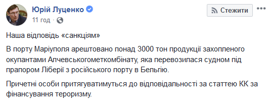 "Наш ответ "санкциям". В порту Мариуполя арестовано более 3 000 тонн продукции захваченного оккупантами Алчевского меткомбината, которая перевозилась судном под флагом Либерии в Бельгию. Причастные лица будут привлекаться к ответственности по статье УК за финансирование терроризма", - написал Юрий Луценко.
