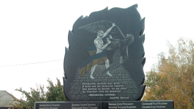 В сети обсуждают странную мемориальную плиту героям Небесной сотни, установленную в Борисполе. На ней изображен полуголый козак Гаврилюк, который сражается с черным беркутом. При том, что Михаил Гаврилюк не погиб на Майдане и к Небесной сотне отношения, мягко говоря, не имеет.