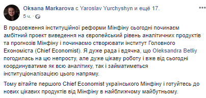 "В продолжение институциональной реформы Минфина сегодня начинаем амбициозный проект выведения на европейский уровень аналитических продуктов и прогнозов Минфина и начинаем создавать институт главного экономиста. Я очень рада и благодарна, что Александра Бетлий согласилась на эту непростую, но очень интересную, работу", - написала Макарова в Facebook.
