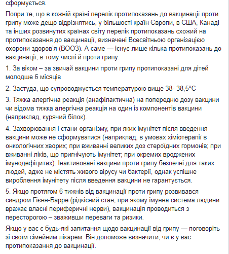 Супрун перечислила и противопоказания такой процедуры: вакцины против гриппа не вводятся детям младше 6 месяцев, а также больным, у которых простуда сопровождается температурой выше 38 - 38,5°С. Кроме того, в этот список входит тяжелая аллергическая реакция (анафилактическая) на предыдущую дозу вакцины или известная тяжелая аллергическая реакция на один из компонентов вакцины (например, куриный белок).