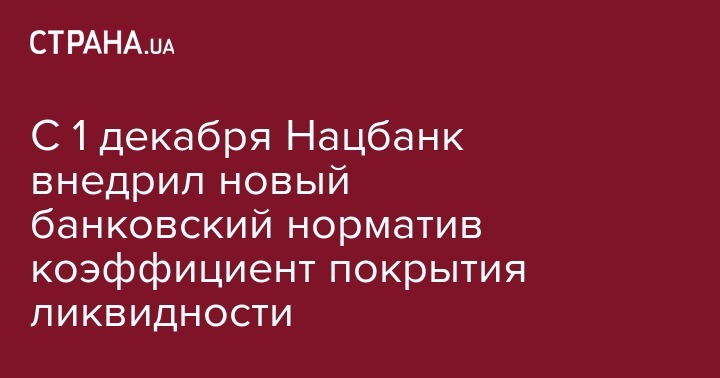 С 1 декабря 2018 года Нацбанк вводит обязательный норматив ликвидности - коэффициент покрытия ликвидностью (LCR). Решение Правления учитывает итоги проведения тестовых расчетов LCR, которые проводились с 1 июня 2018 года. Норматив LCR установлен по всем валютам, а также отдельно по группе иностранных валют. Банки также будут рассчитывать коэффициент LCR в гривне, однако НБУ не определяет его обязательное минимальное значение, передает ЮрЛига.