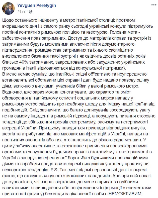 "В то же время, уже сейчас можно констатировать, что характер и содержание обсуждения в итальянском сегменте социальных сетей нападения в римском метро свидетельствует о незаурядном ущербе для имиджа нашей страны от подобных действий", - добавил Перелыгин.