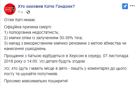 "Прощание с Катей состоится в Херсоне в среду, 7 ноября 2018 года, в 14:00. Все детали будут позднее", - говорится в сообщении сообщества на странице в Facebook в понедельник вечером.