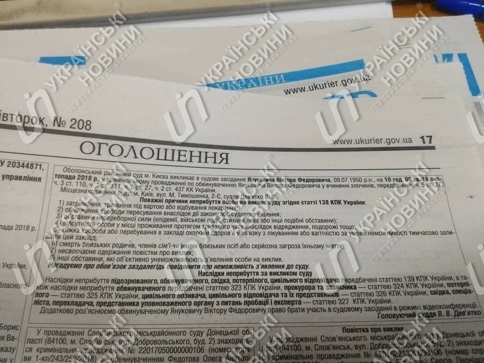 Оболонский районный суд Киева вызывает экс-президента Украины Виктора Януковича на заседание для оглашения его последнего слова 19 ноября. Об этом сообщают "Украинские новости" со ссылкой на публикацию в правительственной газете "Урядовий кур'єр".