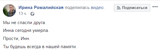 Свой последний пост в Facebook Инна Жмуд написала 6 ноября: "Сегодня я поняла одну вещь. Иногда лучше чего-то просто не знать. Чтобы не накручивать себя. Чтобы не реветь. Чтобы не думать о плохом. Просто не знать. Потому что это так тяжело... И так. Ты - сильная, мужественная, бла-бла... но...".