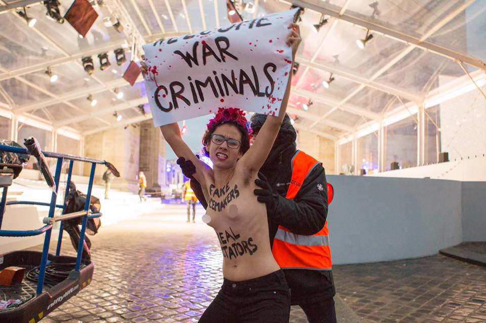 Акция началась около 08:00 по местному времени (09:00 по киевскому времени). Три оголенные по пояс девушки вышли к Триумфальной арке и обратились к прибывающим в город мировым лидерам с плакатами "Добро пожаловать, военные преступники!" и "Война это мир, свобода это рабство, невежество это сила".