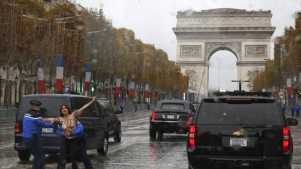 В Париже кортеж президента США Дональда Трампа пыталась остановить обнаженная активистка. Об этом передает BFMTV в Twitter.