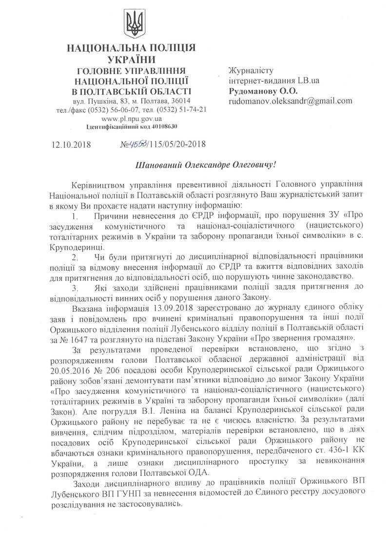 В Оржицком отделе полиции в свою очередь заявили, что бюст Ленина в Крупнодеринцах не находится на балансе сельсовета и является бесхозным. Поэтому в действиях должностных лиц Крупнодеринского сельского совета нет уголовного правонарушения по ст. 436-1 Уголовного кодекса (хотя есть признаки дисциплинарного проступка за невыполнение распоряжения председателя Полтавской ОГА).