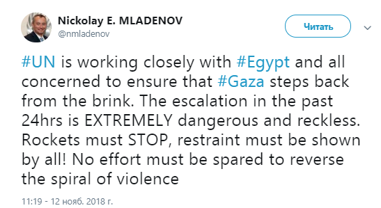 Специальный координатор ООН по ближневосточному мирному процессу Николай Младенов заявил, что ООН, Египет и другие стороны работают над тем, чтобы остановить активную фазу противостония Израиля и ХАМАС. "Эскалация последних 24 часов крайне опасна и безрассудна. Ракетные обстрелы должны прекратиться, стороны должны продемонстрировать сдержанность", - заявил он.