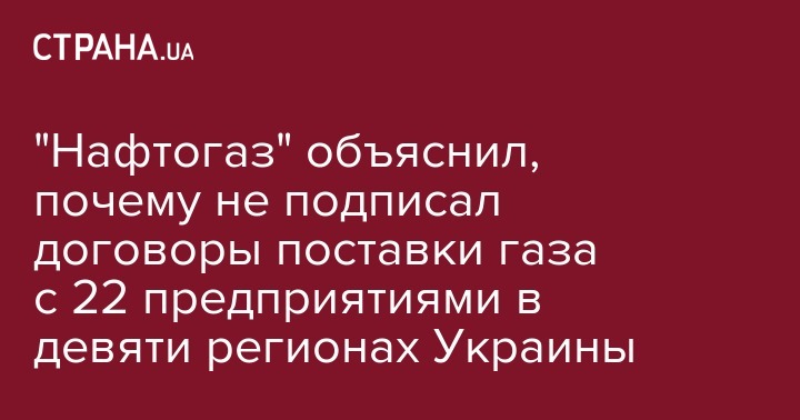 Национальная акционерная компания "Нафтогаз Украины" отказалась заключать договоры на поставку газа для начала отопительного сезона с 22 теплоснабжающими предприятиями страны из-за накопления существенных долгов перед "Нафтогазом" и отсутствия договоров о их реструктуризации. Об этом сообщила пресс-служба "Нафтогаза".