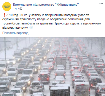 В связи с ухудшением погоды и первым снегом в Киеве введен спецрежим курсирования общественного транспорта. Об этом сообщила пресс-служба "Киевпасстранса" на своей странице в Facebook.