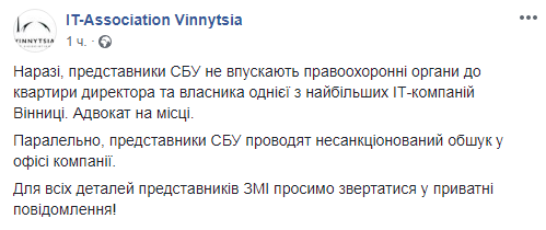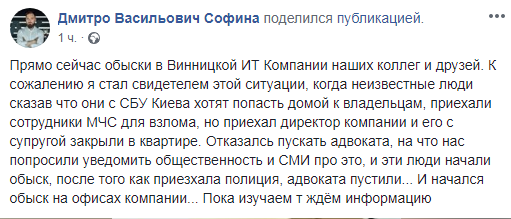 Глава Винницкой IT-ассоциации Дмитрий Софина на своей странице в Facebook отметил, что сам он стал свидетелем ситуации, когда неизвестные люди, представившись сотрудниками СБУ из Кива, вызвали сотрудников МЧС для взлома двери в квартиру Гнатовского. Также, по его словам, сбушники согласились впустить адвоката только после прибытия на место полиции. Пока что неизвестно, с чем связаны обыски и изымается ли техника и документы в офисе компании.