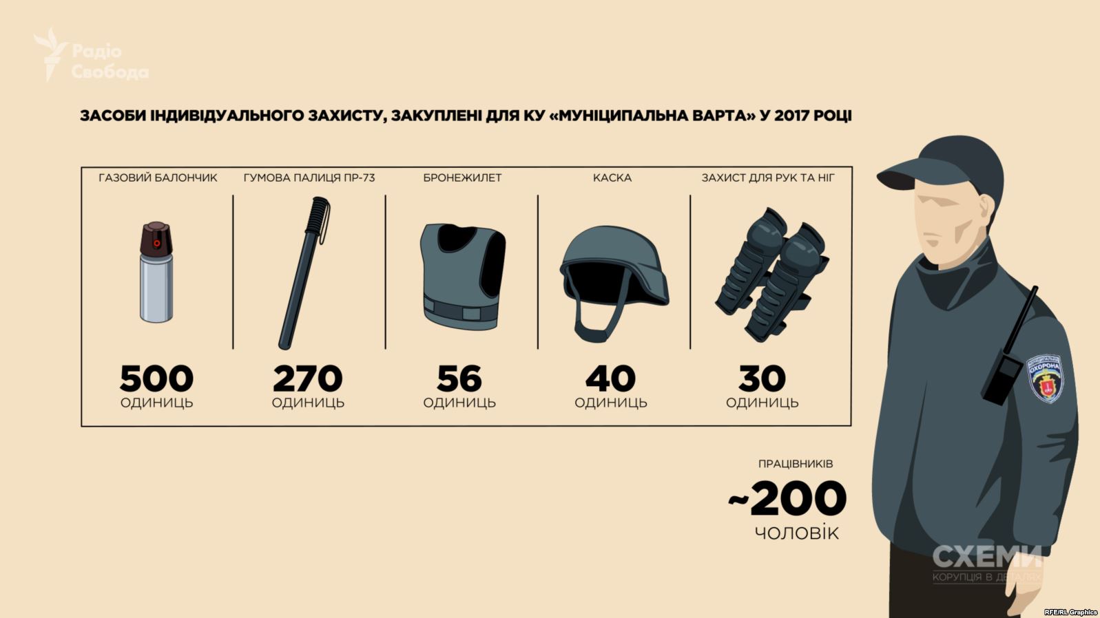В расследовании речь идет о том, что муниципальной охране закупаются спецсредства. Например, в 2017 году одесские дружинники получили из бюджета города 750 тысяч гривен на покупку "средств индивидуальной защиты", в том числе, бронежилетов, резиновых дубинок и газовых баллончиков.