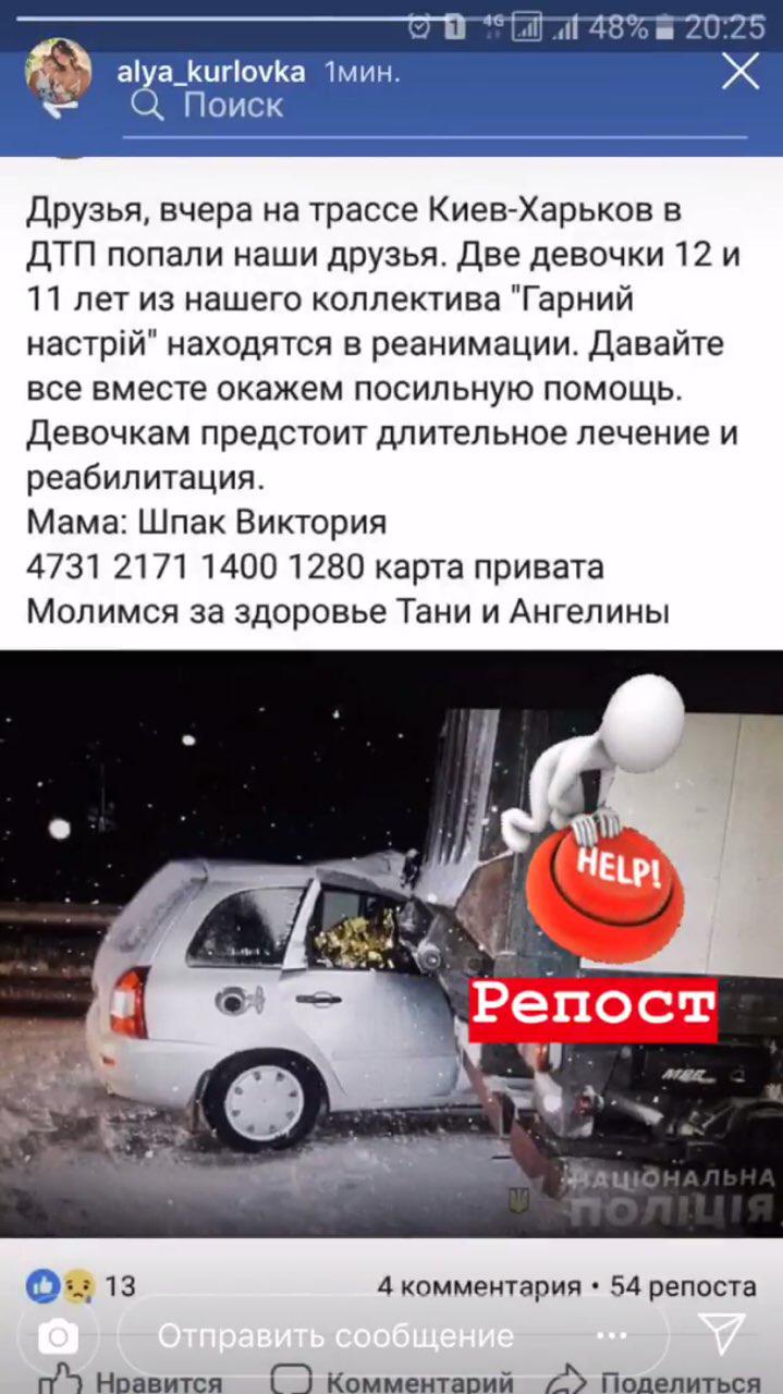 Для сбора помощи в среду, 21 ноября, в 18:30 в Полтавском городском доме культуры состоится благотворительный концерт. Его организует Образцовый ансамбль танца "Гарний настрій", участницами старшей группы которого являются обе пострадавшие в автокатастрофе.