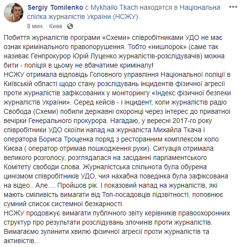 Напомним, инцидент, когда журналистов радио "Свобода" (Схемы) избили государственные охранники из-за интереса к приватной вечеринке Генерального прокурора произошел в сентябре 2017 года. Сотрудники УГО совершили нападение на журналиста Михаила Ткача и оператора Бориса Троценко рядом с ресторанным комплексом под Киевом (оператор получил повреждения руки). Ситуация получила широкую огласку, рассматривалась на заседании парламентского Комитета свободы слова. "Журналистское сообщество было возмущено цинизмом сотрудников УГО, че наглое поведение было зафиксировано на видео... Но... Прошел год. И показательное нападение на журналистов, которые имеют смелость требовать от топ-чиновников подотчетности, пополняет печальный список системной безнаказанности", - акцентировал глава НСЖУ.