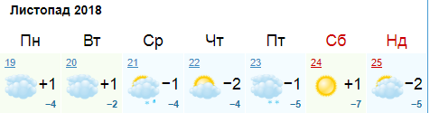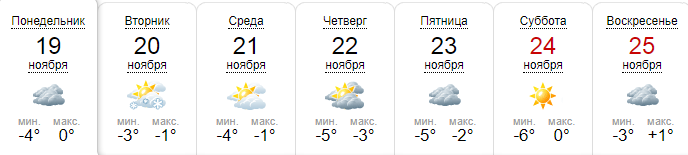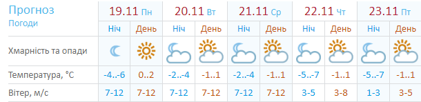 Как пишет Sinoptik.ua, во вторник, 20 ноября, возможен снег. В остальные дни - без осадков. Дневная температура от +1 до -3, ночью -1...-6. Самый холодный день недели четверг.