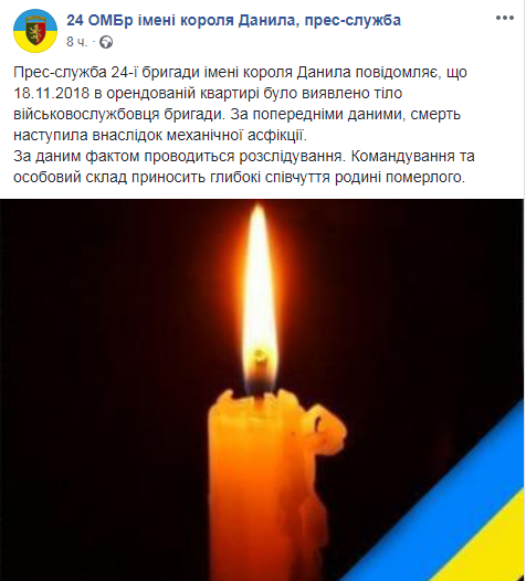 18 ноября в городе Яворов Львовской области в одной из квартир обнаружили тело задушенного украинского военного. Об этом сообщает пресс-служба 24 ОМБр им. короля Данила на своей странице в Facebook.