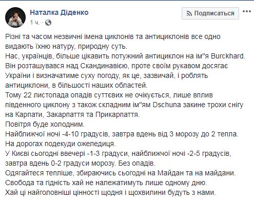 "Одевайтесь теплее, собираясь сегодня на Майдан и майданы. Свобода и достоинство пусть не будут принадлежать лишь одному дню. Пусть эти самые главные ценности ежедневно и ежеминутно будут с нами", - резюмировала Диденко.