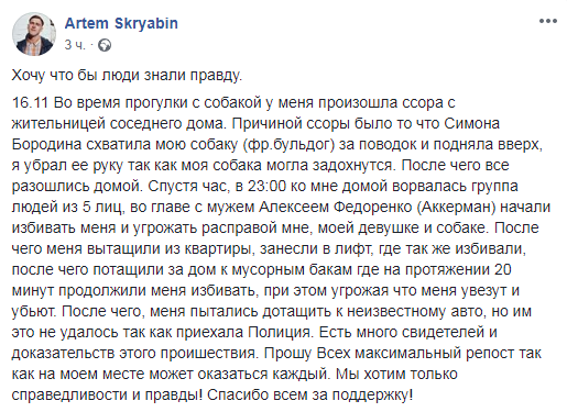 "Спустя час, в 23:00 ко мне домой ворвалась группа людей из 5 лиц, во главе с мужем Алексеем Федоренко (Аккерман) начали избивать меня и угрожать расправой мне, моей девушке и собаке. После чего меня вытащили из квартиры, занесли в лифт, где так же избивали, после чего потащили за дом к мусорным бакам где на протяжении 20 минут продолжили меня избивать, при этом угрожая что меня увезут и убьют. После чего, меня пытались дотащить к неизвестному авто, но им это не удалось так как приехала Полиция", - написал молодой человек.