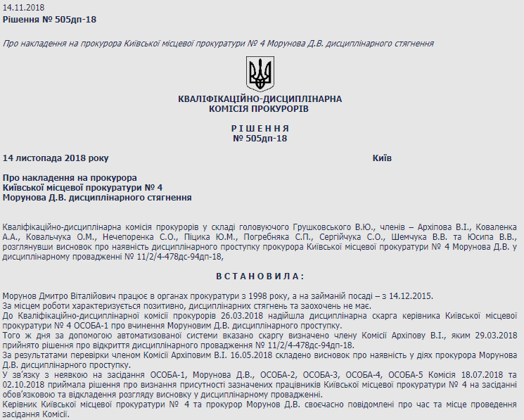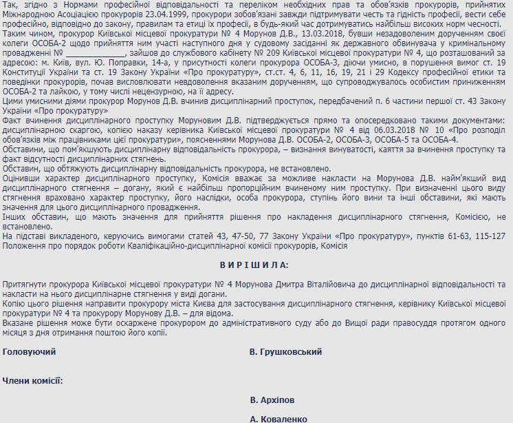 В телефонном режиме он так и сказал коллеге по прокуратуре, отвечающей за получение прокурорами судебных повесток. Однако на этом этапе и возникло недопонимание. Вероятно в суд никто так и не пошел по повестке из-за которой разгорелся сыр-бор. Поэтому вернувшись на работу, прокурор Морунов осыпал младшую коллегу ругательствами и вероятно до такой степени ее обидел, что она через руководство Киевской местной прокуратуры N 4 инициировала обращение в квалификационную комиссию прокуроров по этому поводу.